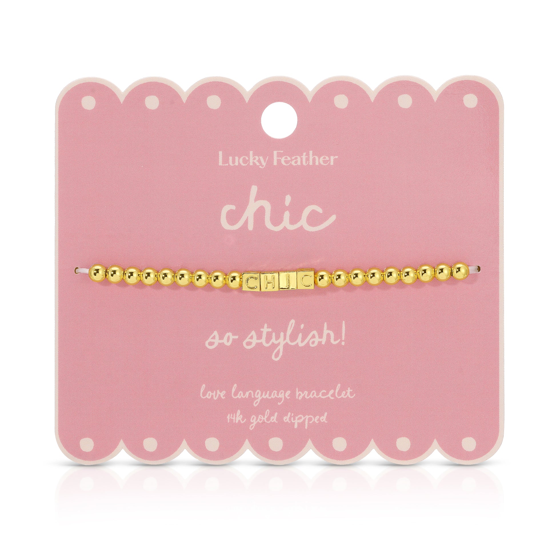 Keep it stylish with the Chic Love Language Bracelet. Designed with 14k gold-dipped beads that spell "Chic" (French for "stylish"), this bracelet is a fashionable addition to any outfit. Sophisticated yet fun, it’s the ultimate accessory for modern elegance.