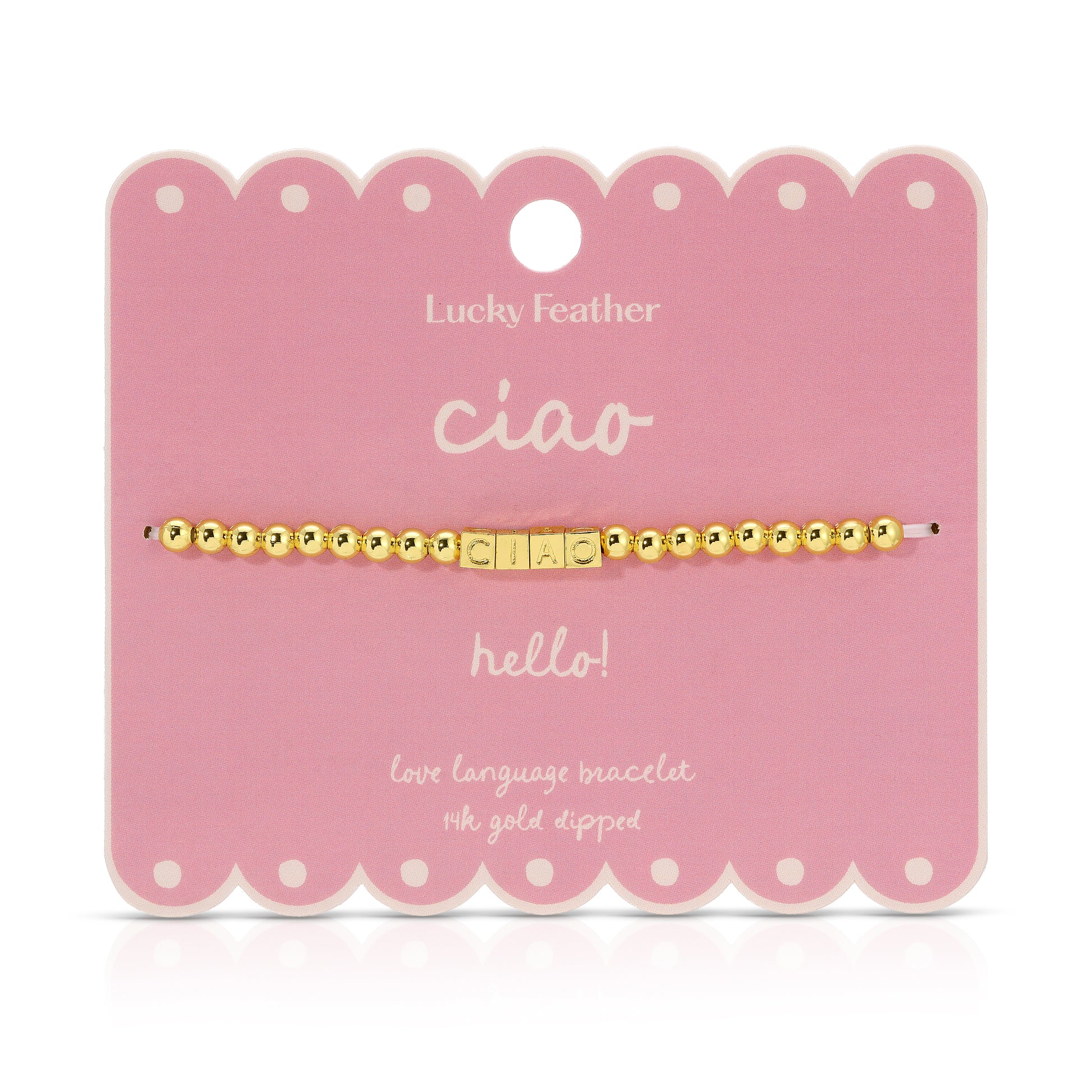 Say hello to effortless style with the Ciao Love Language Bracelet. Featuring 14k gold-dipped beads spelling "Ciao" (Italian for "hello"), this bracelet adds a playful touch to your jewelry collection. Perfect for everyday wear or as a unique gift.