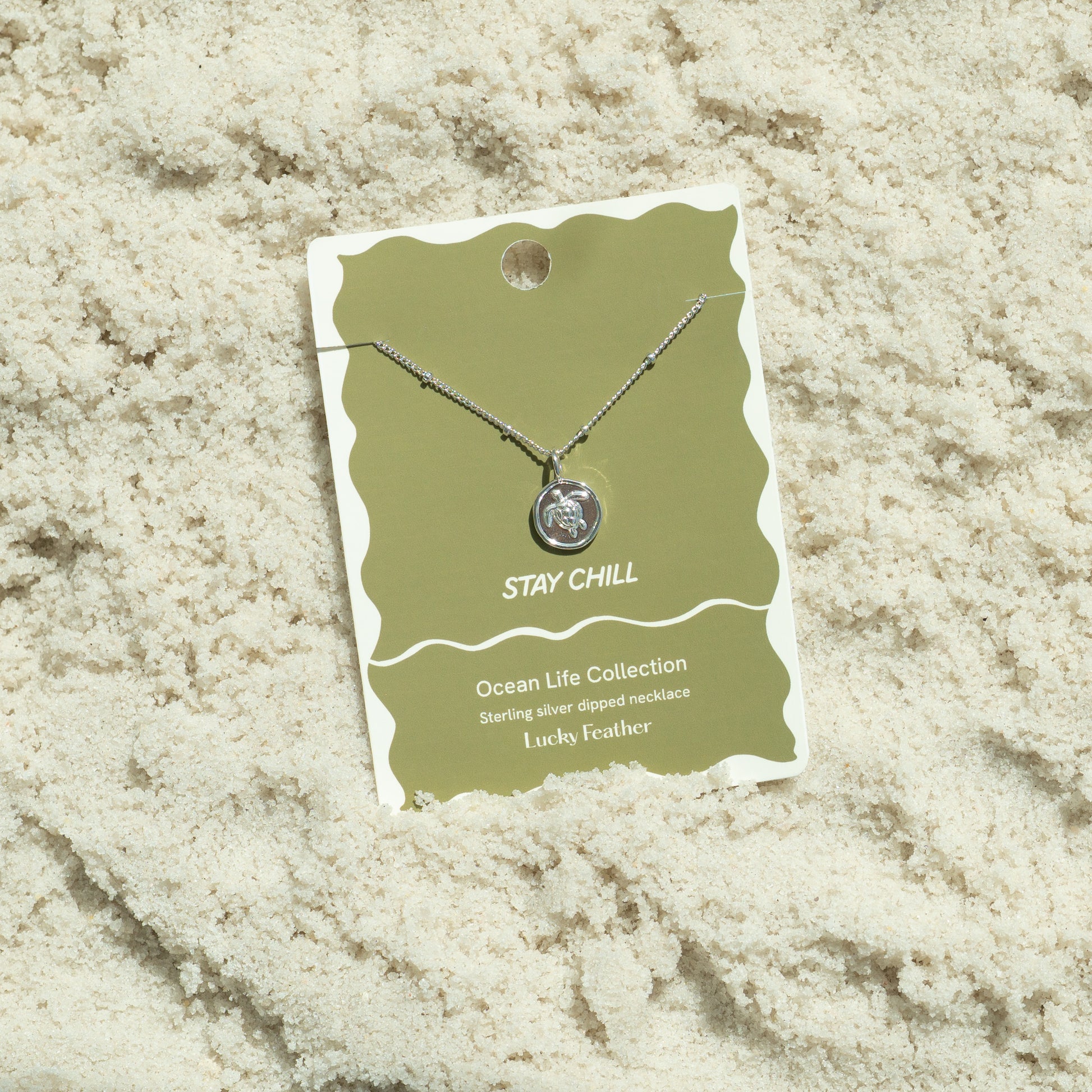 Stay chill with this silver-dipped sea turtle necklace—an ode to the ocean’s most peaceful traveler. Symbolizing patience and protection, it’s a charming gift or keepsake for beachgoers and ocean lovers alike.